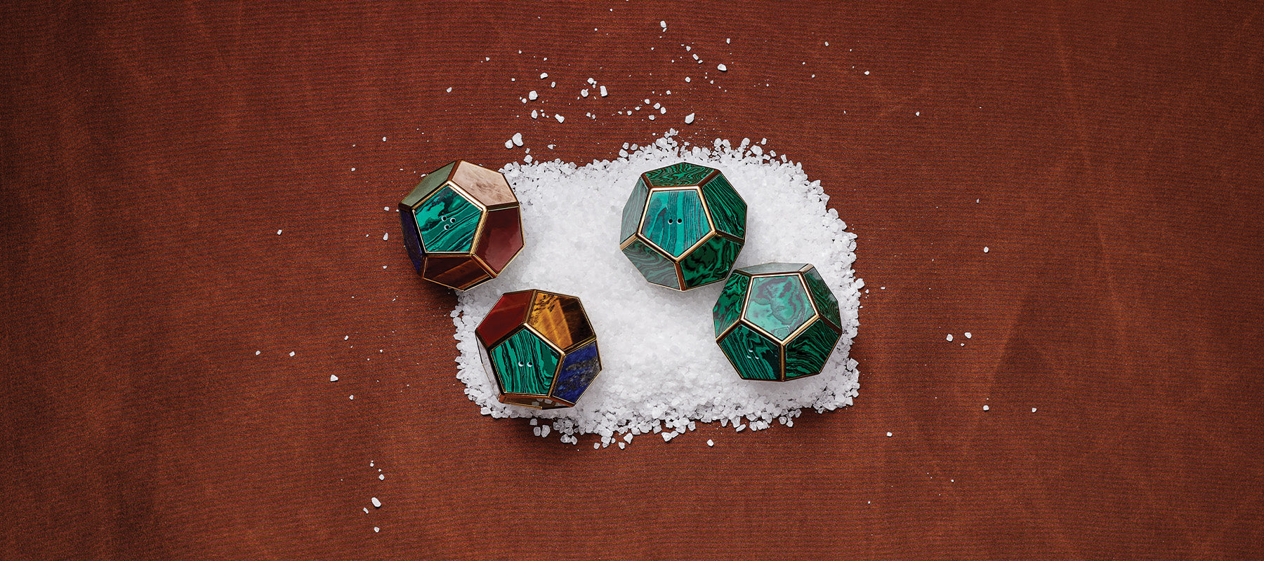 Handcrafted with meticulous attention to detail, featuring pentagon facets and gold-platted brass details. One of the pairs is fully adorned with malachite facets, a celebrated classic brand pattern. The other is an elegant combination of semi-precious stones, including Malachite, Lapis, Onyx, Tiger-eye, Jade, and Red Agate.