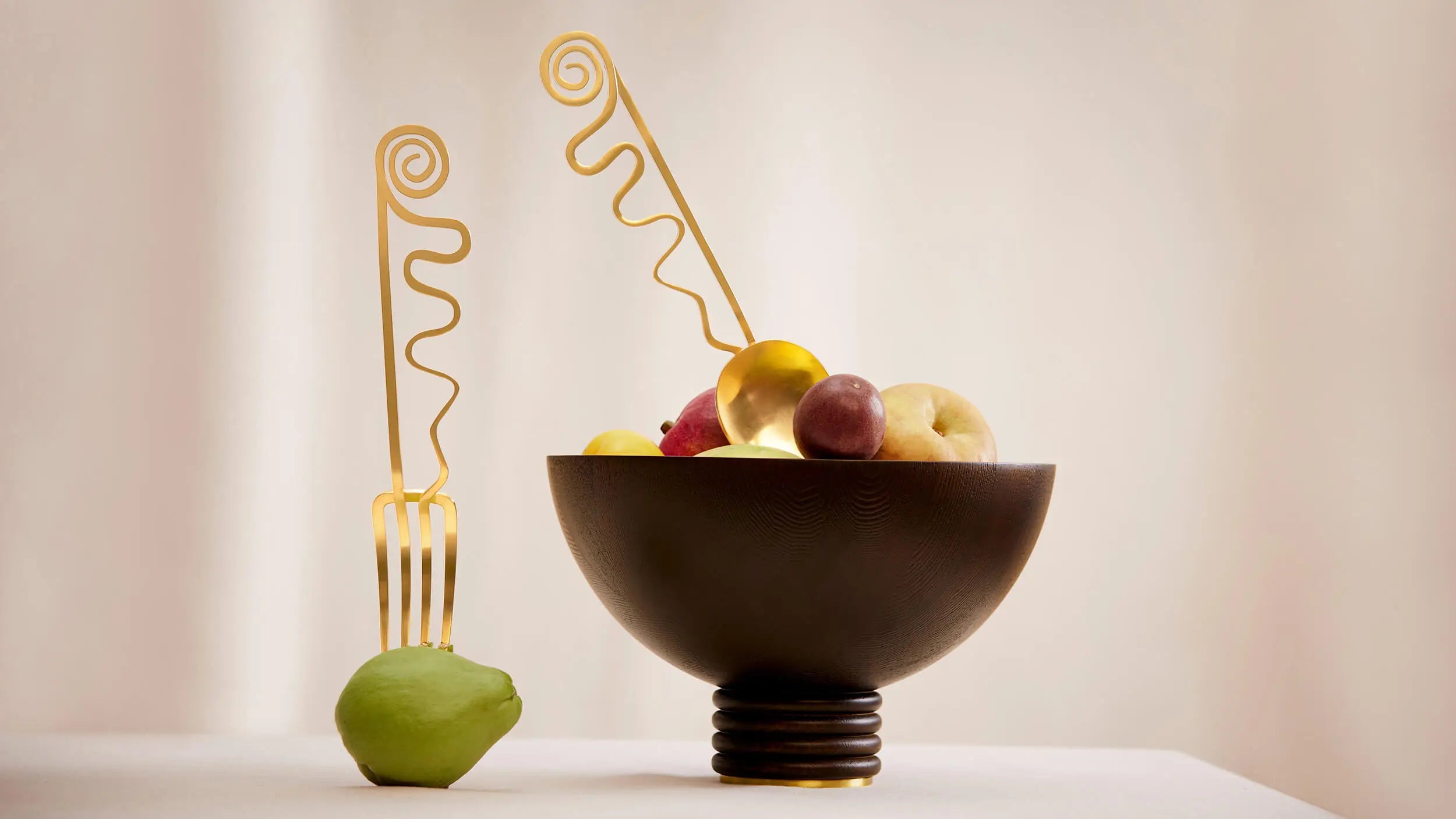 L’OBJET introduces Spirale, created with Portuguese jeweller Sebastião Lobo. Known for his approach to metalwork, the local artisan and long-time friend of L’OBJET brings out his artistic vision with a series of cocktail cutlery and servers inspired by Alexander Calder’s kinetic sculptures. Crafted in 24k gold-plated metal, these twisted, spiralling forms elevate everyday objects into art.