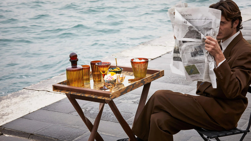 The PRISM collection now extends into a complete suite of barware, including flutes, shakers, decanters, ice buckets, and more. Each piece is crafted in luminous hand-cut glass and finished in rich tones. With bold geometry and a refined sense of proportion, every piece is designed to be both functional and visually striking.